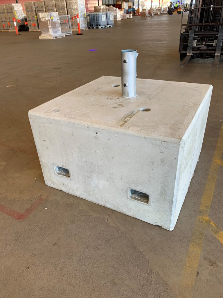 Stable precast concrete base sizes start from 1000mm x 1000mm x 600mm in height, all bases come with galvanised fork tine recesses, that are centrally positioned, offering positive retention while offloading and moving over uneven ground to their location for installation.